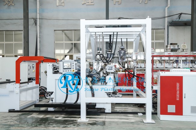 本機是通過對PET瓶片破碎料和原料干燥結晶后進入生產(chǎn)線融化后擠出片材。PET–干燥結晶—平雙擠出機–模具—三輥壓延機—冷卻托架–涂硅油—牽引機—儲帶機–切邊裁斷機–收卷機–成品包裝入庫。